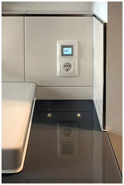 Mittels Spezialkleber oder Verschraubung wird das Glas befestigt (ggf. auch auf Ihren alten Fliesen). Die Bohrungen für Ihre Steckdosen werden dabei berücksichtigt. Der Einbau geht schnell und sauber.