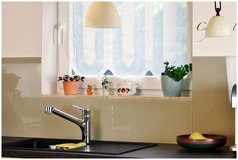 Glasrückwand cappuccinofarben.