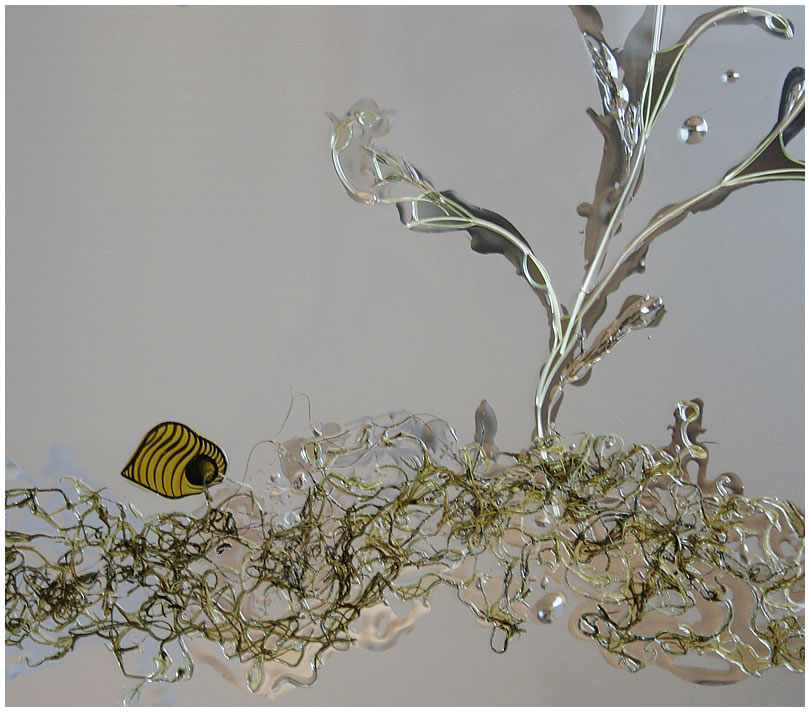 Die Ganzglastür Wasserwelt mit Ranken aus feinen Naturgräsern lädt zur Entspannung ein. In satiniertem Glas in Punktoptik (PO) wird das Design mit Kugel- und Zackenfisch, sowie Schnecke (wahlweise Muschel) ergänzt. Auf Wunsch steht auch ein Krebs zur Auswahl.